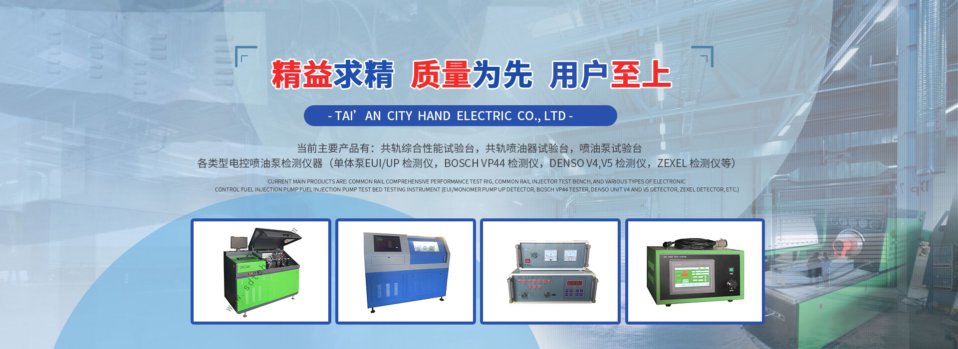 泰安市漢德電氣有限責(zé)任公司是設(shè)計(jì)、制造和生產(chǎn)內(nèi)燃機(jī)檢測試驗(yàn)設(shè)備的企業(yè),集生產(chǎn)制造、配件銷售為一體。隨著全球環(huán)境對環(huán)保要求的日益提高,內(nèi)燃機(jī)技術(shù)相應(yīng)取得長足進(jìn)步,尤其是柴油機(jī)噴射系統(tǒng)正向著高壓、電控技術(shù)的方向迅猛發(fā)展,基于此,我們公司目前著力開發(fā)、拓展專門針對于高壓共軌系統(tǒng)和其他電控噴射系統(tǒng)的檢測設(shè)備,當(dāng)前主要產(chǎn)品有:共軌綜合性能試驗(yàn)臺,共軌噴油器試驗(yàn)臺,噴油泵試驗(yàn)臺,各類型電控噴油泵檢測儀器...